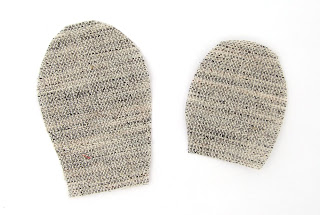 5. To make flowers I chose the Therm O web hair canvas interfacing. It look a lot like burlap that everyone is using in decorating but it it has two big pluses in my book. One it doesn't fray like burlap and it's not scratchy and dusty to work with. I made two different sizes of flowers by cutting petal shapes. To make a flower, I would run a gathering stitch continuously across the bottom of five to six petals. Once they are stitched, pull the thread so the petals come together in the center. Run some stitches along the base to hold the petals together.